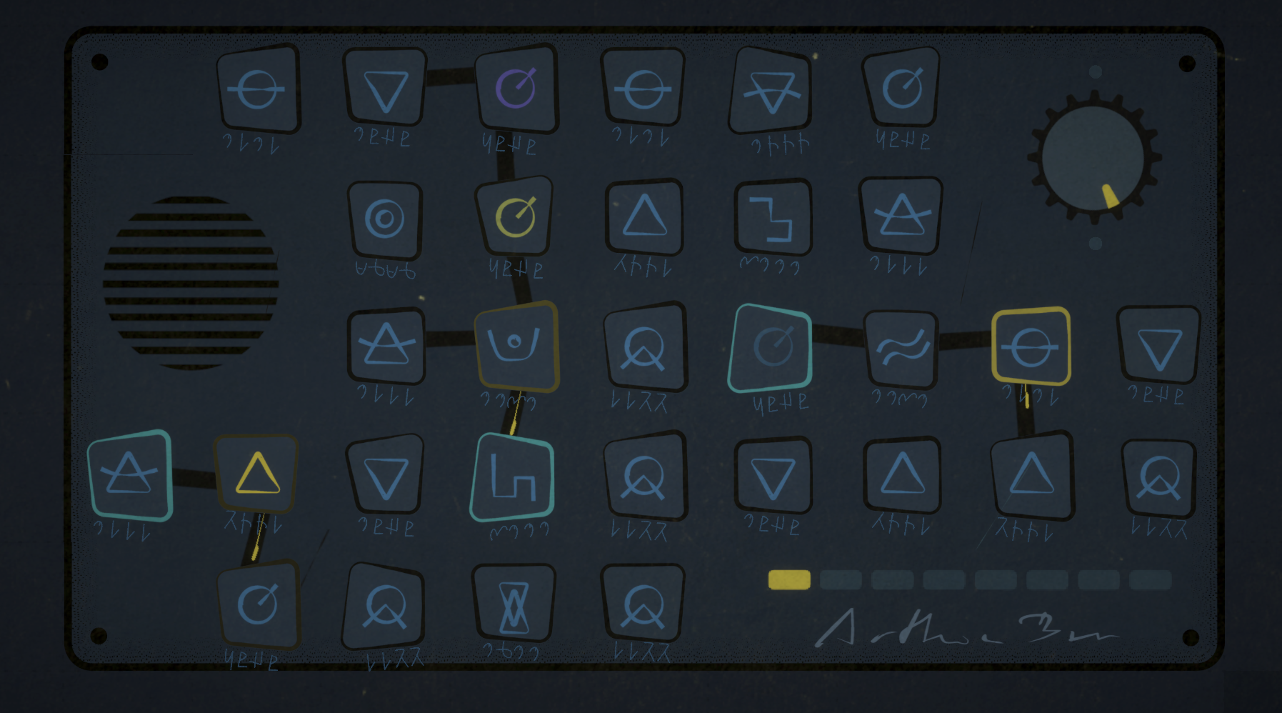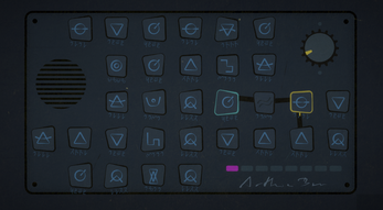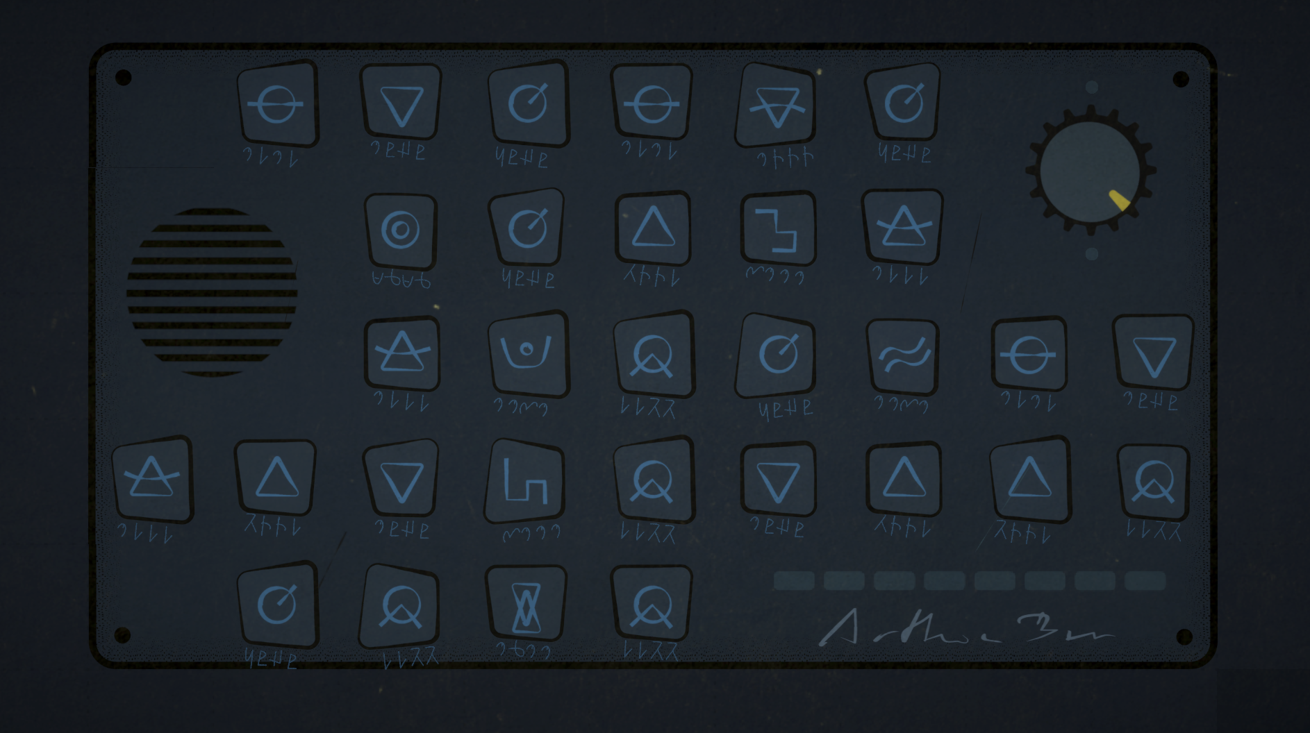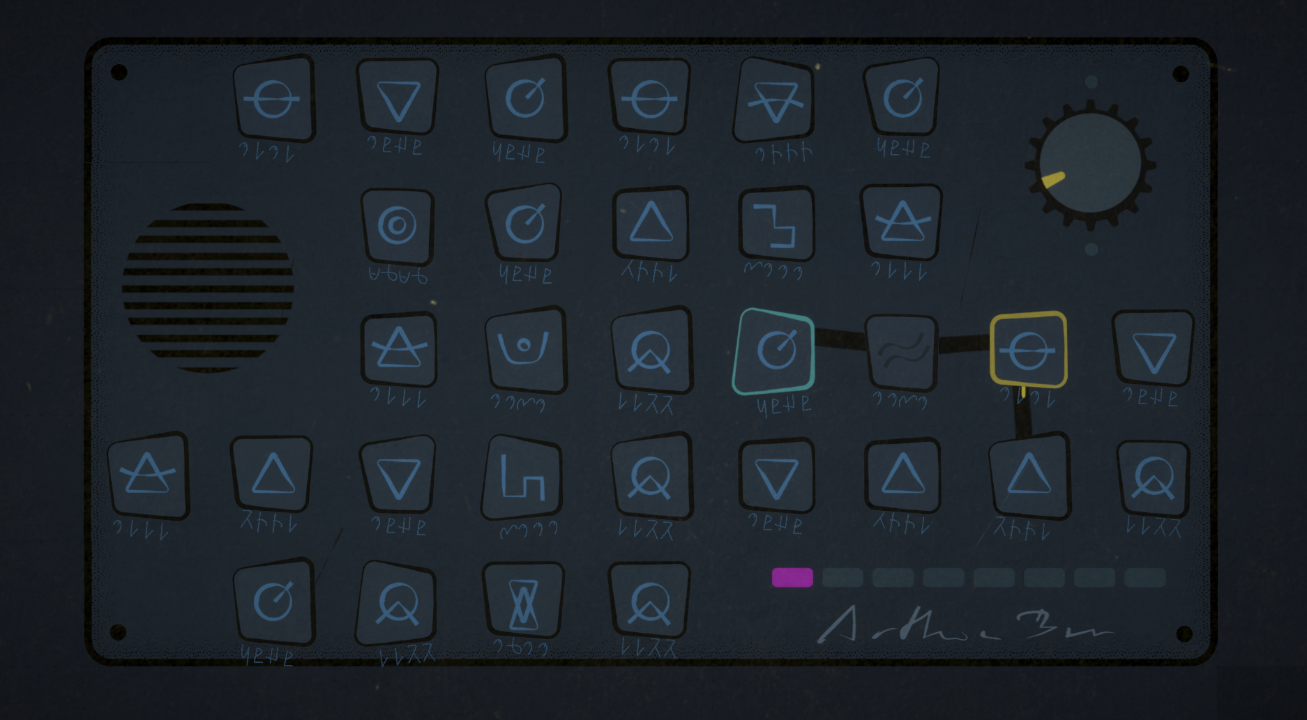 Use your mouse to select and click certain buttons on the equipment which locks ArthonBru in his prison. The music will start playing, in loops which you have selected by pressing neighbouring buttons.
